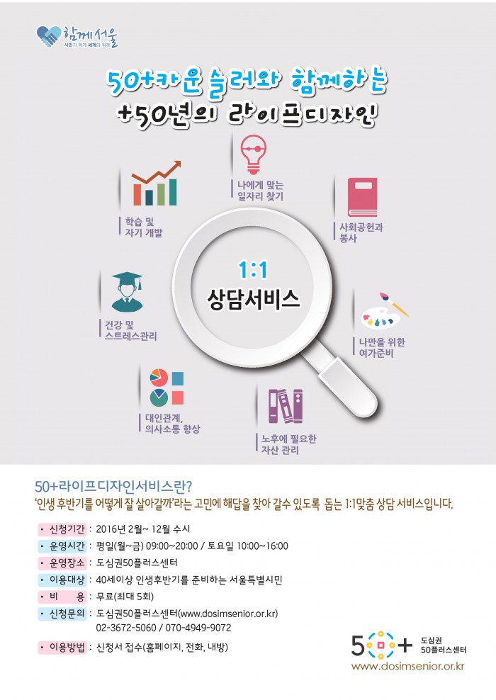 (서울=포커스뉴스) 서울시는 도심권50플러스센터를 통해 40세 이상의 은퇴자나 은퇴예정자의 인생 설계를 위한 상담서비스 '50+카운슬러와 함께하는 +50년 라이프디자인' 프로그램을 운영한다고 10일 밝혔다.