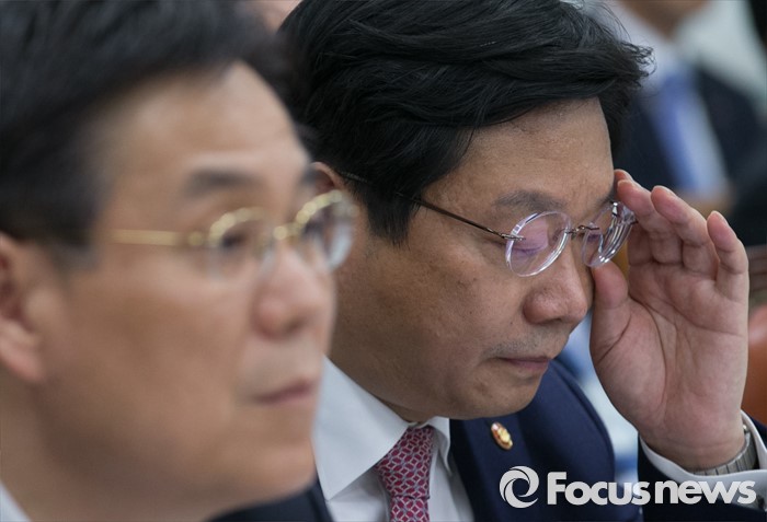 (서울=포커스뉴스) 10일 오후 서울 여의도 국회에서 열린 산업통상자원위원회 전체회의에 참석한 주형환(오른쪽) 산업통상자원부 장관이 안경을 고쳐쓰고 있다.