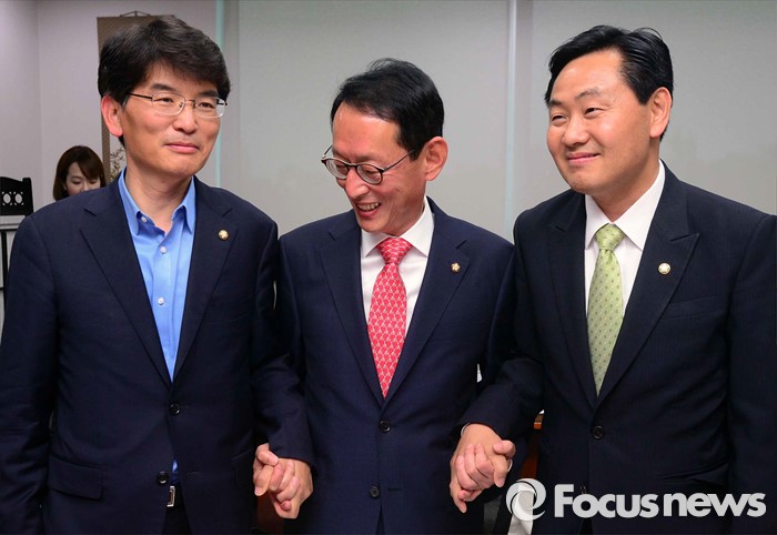 (서울=포커스뉴스) 김도읍(가운데) 새누리당 원내수석부대표, 박완주(왼쪽) 더불어민주당 원내수석부대표, 김관영 국민의당 원내수석부대표가 10일 오후 서울 여의도 국회 의원회관에서 박근혜 대통령과 여야 신임 원내지도부 회동 의제 조율을 위한 논의에 앞서 취재진을 향해 포즈를 취하고 있다.