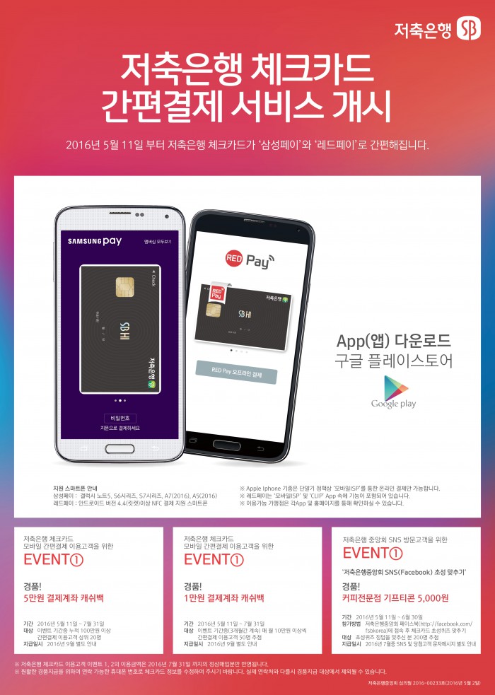 10일 저축은행중앙회는 저축은행 체크카드 사용자들은 11일부터 레드페이, 오는 12일 새벽 2시부터는 삼성페이를 등록해 이용할 수 있다고 밝혔다.