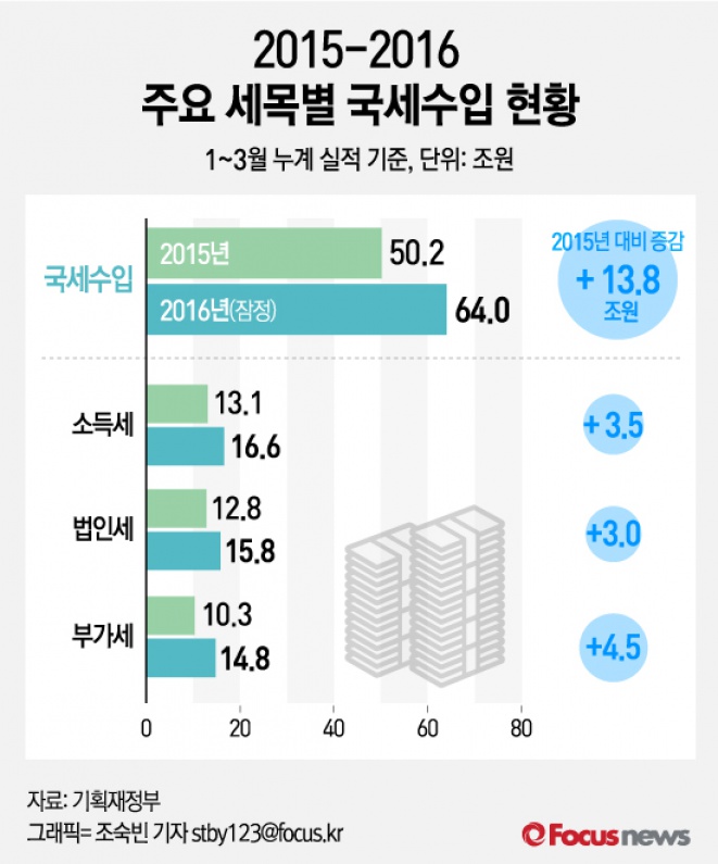 (서울=포커스뉴스) 10일 기획재정부가 발간한 ‘재정동향 5월호’에 따르면1~3월까지 국세수입은 전년 동기보다 13조8000억원이 늘어난 64조원을 기록한 것으로 나타났다.