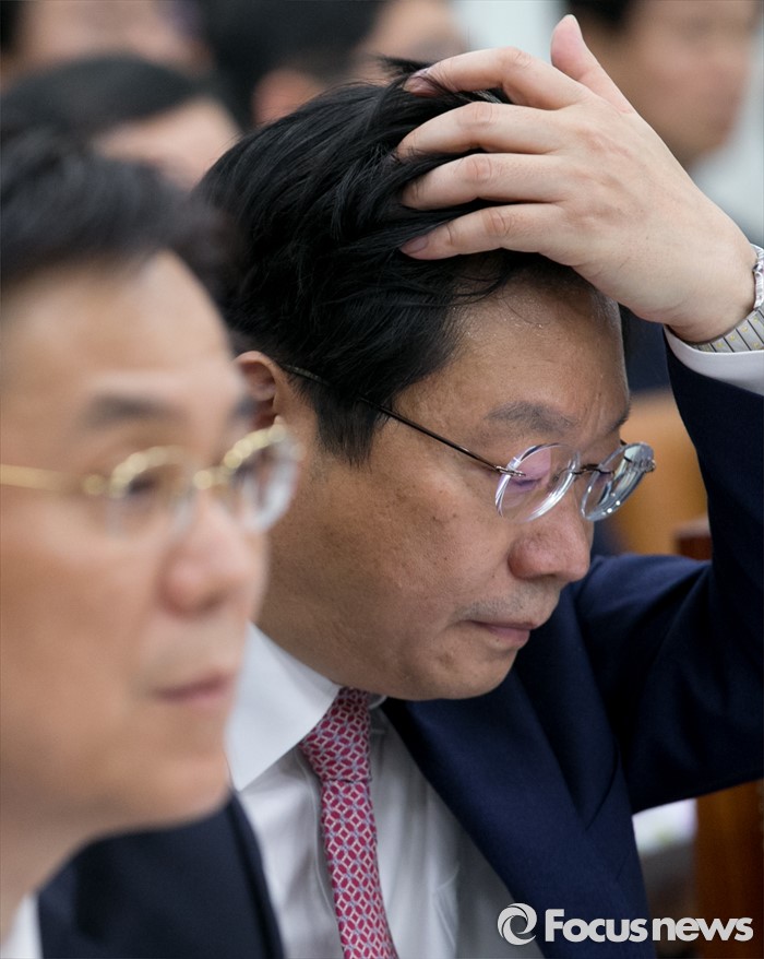 (서울=포커스뉴스) 10일 오후 서울 여의도 국회에서 열린 산업통상자원위원회 전체회의에 참석한 주형환(오른쪽) 산업통상자원부 장관이 머리를 만지고 있다.