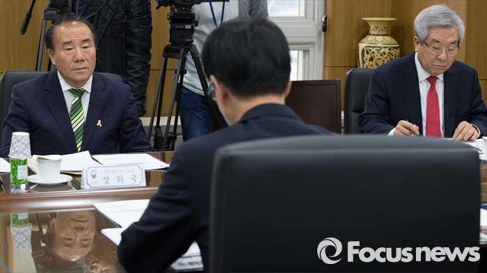 (세종=포커스뉴스) 장휘국(왼쪽) 광주광역시교육감, 김복만(오른쪽) 울산광역시교육감이 10일 오후 세종시 정부세종청사 교육부 중회의실에서 열린 전국시도교육감협의회 회장단 간담회에 참석해 이준식 사회부총리 겸 교육부장관의 발언을 경청하고 있다.