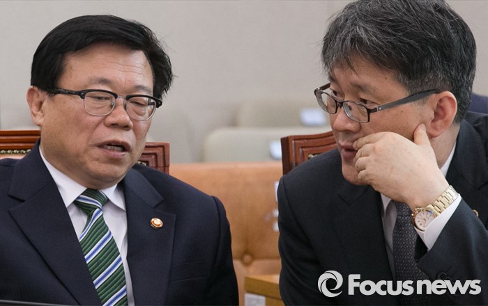 (서울=포커스뉴스) 10일 오후 서울 여의도 국회에서 농림축산식품해양수산위원회 전체회의에 앞서 이동필(왼쪽) 농림축산식품부 장관, 여인홍 차관이 대화하고 있다. 이날 회의는 세월호 특별법 개정안 내용 중 특조위 활동 기간 연장과 관련 이견 등으로 여당 의원들이 불참한 채 진행됐다.