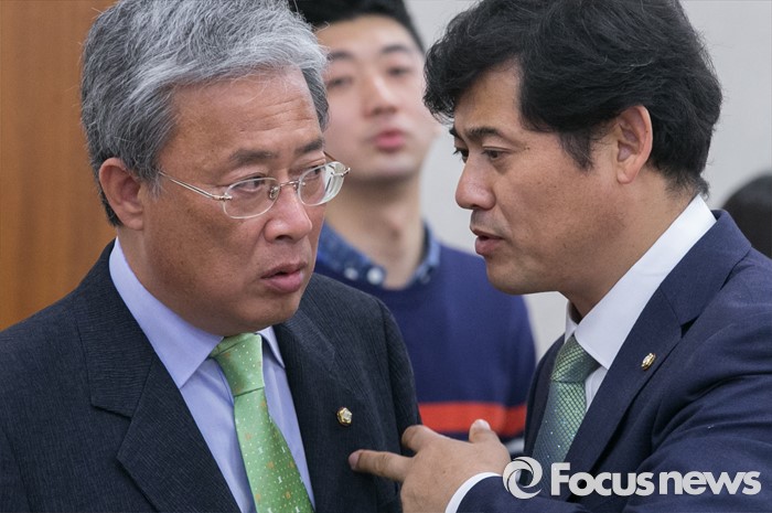 (서울=포커스뉴스) 10일 오후 서울 여의도 국회에서 열린 농림축산식품해양수산위원회 전체회의에 참석한 박민수(오른쪽) 더불어민주당 간사와 유성엽 국민의당 의원이 대화하고 있다. 이날 회의는 세월호 특별법 개정안 내용 중 특조위 활동 기간 연장과 관련 이견으로 여당 의원들이 불참한 채 진행됐다.