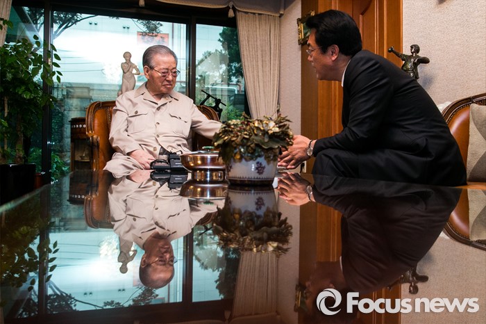 (서울=포커스뉴스) 정진석(오른쪽) 새누리당 원내대표가 10일 오후 서울 중구 김종필 전 총리 자택을 방문해 김 전 총리와 환담을 하고 있다.
