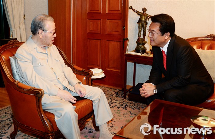 (서울=포커스뉴스) 정진석(오른쪽) 새누리당 원내대표가 10일 오후 서울 중구 김종필 전 총리 자택을 방문해 김 전 총리와 환담을 하고 있다.