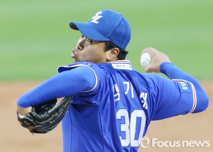 (서울=포커스뉴스) 10일 서울 잠실구장에서 열린 2016 프로야구 삼성-LG 경기에서 1회말 삼성 선발투수 김기태가 투구하고 있다.