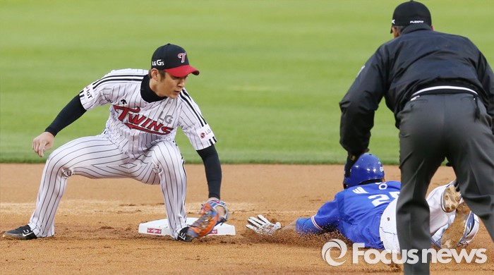 (서울=포커스뉴스) 10일 서울 잠실구장에서 열린 2016 프로야구 삼성-LG 경기 1회초 좌전안타로 진루한 삼성 배영섭이 구자욱 타석때 2루 도루에 성공하고 있다.