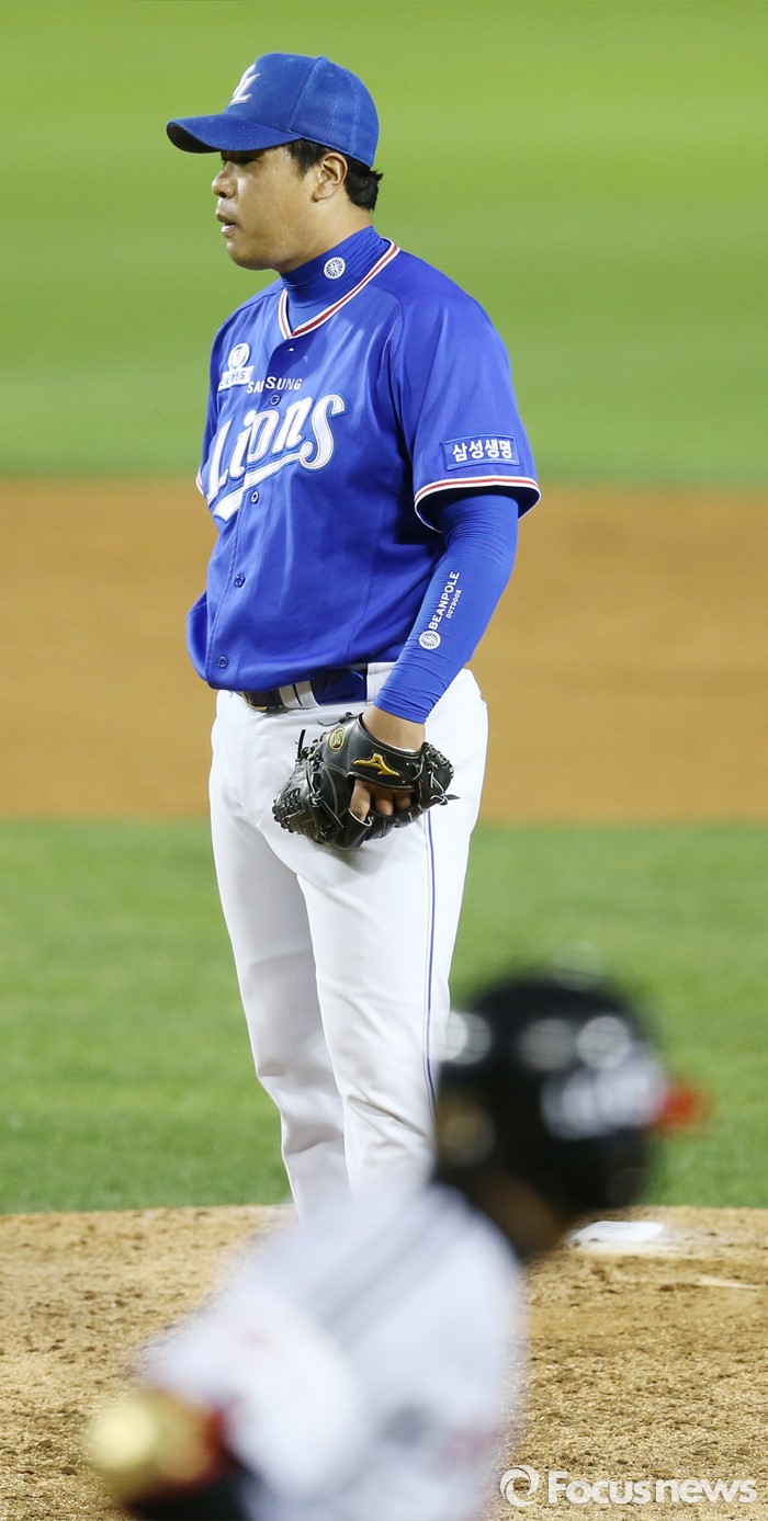 (서울=포커스뉴스) 10일 서울 잠실구장에서 열린 2016 프로야구 삼성-LG 경기에서 삼성 선발투수 김기태가 5회말 1사 1,2루에서 LG 안익훈을 볼넷으로 출루시키고 있다.