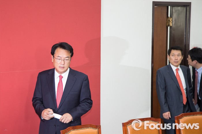 (서울=포커스뉴스) 정진석(왼쪽) 새누리당 원내대표가 11일 오전 서울 여의도 국회에서 원내지도부-중진의원 연석회의에 참석하고 있다.