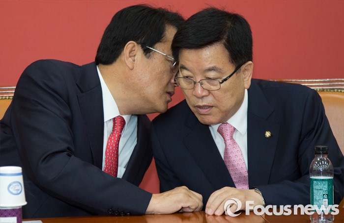 (서울=포커스뉴스) 정진석(왼쪽) 새누리당 원내대표와 김광림 정책위의장이 11일 오전 서울 여의도 국회에서 원내지도부-중진의원 연석회의에 참석해 대화하고 있다.