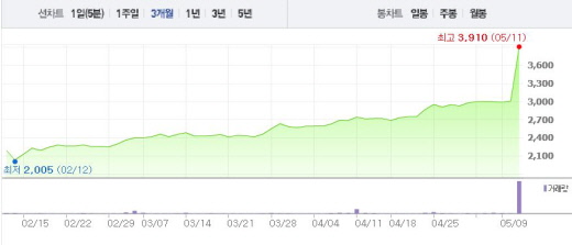 코스모신소재는 11일 오전 9시35분 현재 전일 대비 29.90%(900원) 상승한 3910원에 거래되고 있다. 같은 시각 코스모신소재의 모회사인 코스모화학도 전일 대비 14.41%(675원) 오른 5360원에 거래 중이다.