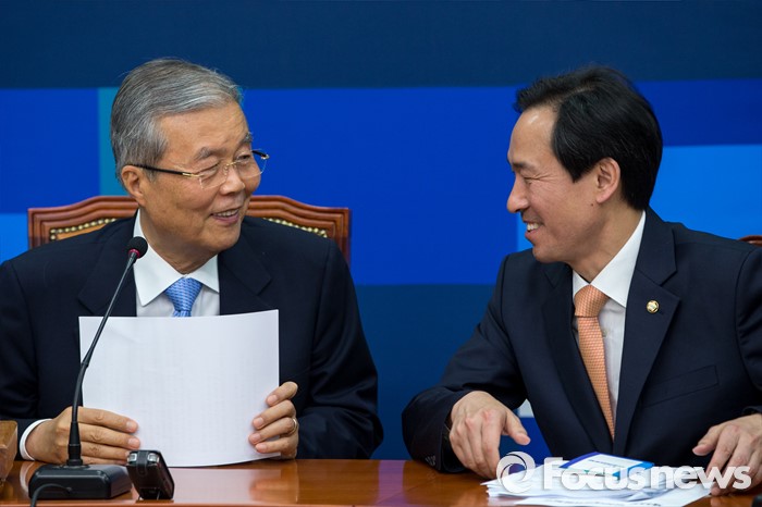 (서울=포커스뉴스) 김종인(왼쪽) 더불어민주당 비상대책위 대표와 우상호 원내대표가 11일 오전 서울 여의도 국회에서 열린 비상대책위원회의에 참석해 대화를 나누고 있다.