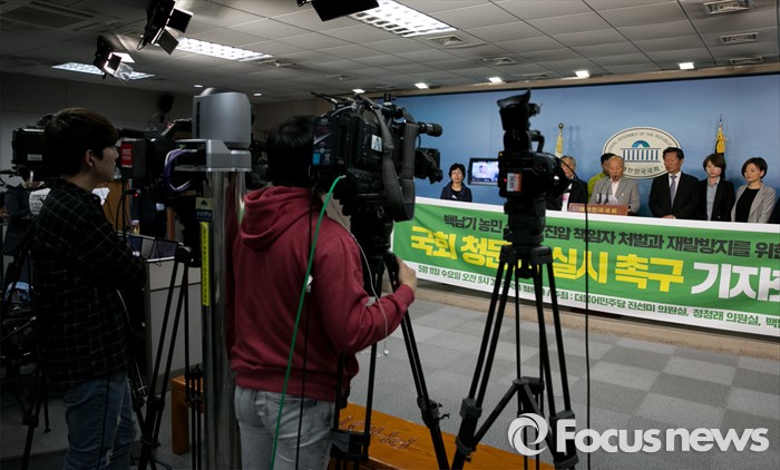 (서울=포커스뉴스) 정청래, 진선미 더불어민주당 의원과 백남기대책위 관계자들이 11일 오전 서울 여의도 국회 정론관에서 백남기 농민 진압 책임자 처벌과 재발방지를 위한 국회 청문회 실시 촉구 기자회견을 하고 있다.