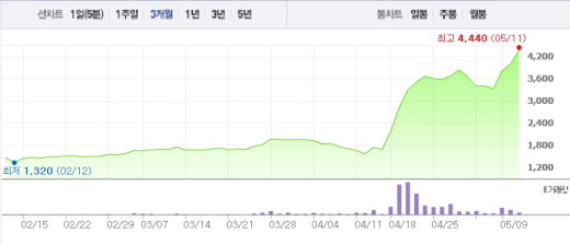 11일 오전 10시18분 현재 뉴보텍은 전일 대비 9.00%(360원) 상승한 4360원에 거래되고 있다. 뉴보텍은 9일과 10일에도 14.46%, 5.26%의 상승폭을 나타내며 상승 곡선을 그리고 있다. 이는 4월 초 주가(1945원)와 비교했을 때 2.24배 상승한 수치다.