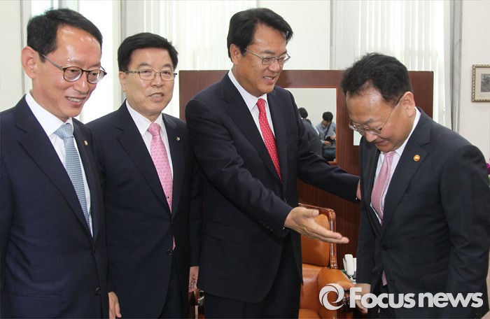 (서울=포커스뉴스) 정진석 새누리당 원내대표 등 원내지도부가 11일 오전 서울 여의도 국회를 방문한 유일호 경제부총리 겸 기획재정부 장관과 면담에 앞서 인사하고 있다. 왼쪽부터 김도읍 원내수석부대표, 김광림 정책위의장, 정 원내대표, 유일호 부총리.