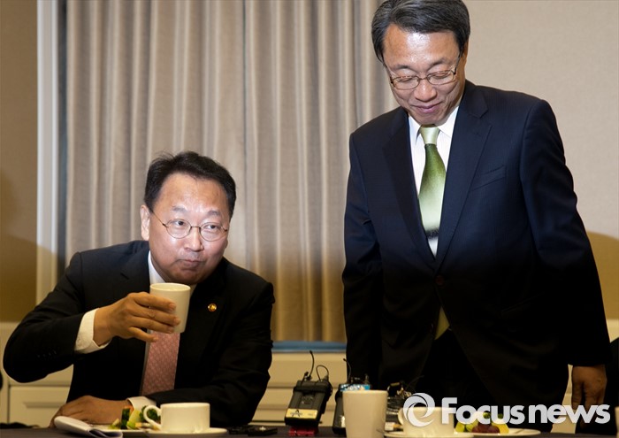(서울=포커스뉴스) 김성식(오른쪽) 국민의당 정책위의장이 11일 오전 서울 여의도 국회 귀빈식당에서 유일호 경제부총리 겸 기획재정부 장관을 만나 면담에 앞서 자리에 앉고 있다.