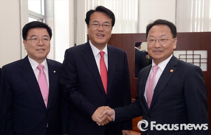 (서울=포커스뉴스) 정진석 새누리당 원내대표 등 원내지도부가 11일 오전 서울 여의도 국회를 방문한 유일호 경제부총리 겸 기획재정부 장관과 면담에 앞서 인사하고 있다. 왼쪽부터 김광림 정책위의장, 정 원내대표, 유일호 부총리.