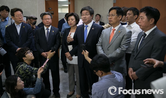 (서울=포커스뉴스) 경기도 6개 기초단체장이 11일 오전 서울 여의도 국회 정론관에서 조정교부금 배분제도 변경에 따른 입장발표 기자회견을 마친 뒤 취재진 질문에 답하고 있다. 왼쪽부터 이재명 성남시장, 채인석 화성시장, 신계용 과천시장, 염태영 수원시장, 최성 고양시장, 정찬민 용인시장.