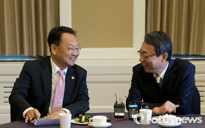 (서울=포커스뉴스) 김성식(오른쪽) 국민의당 정책위의장이 11일 오전 서울 여의도 국회 귀빈식당에서 유일호 경제부총리 겸 기획재정부 장관을 만나 면담을 하고 있다.