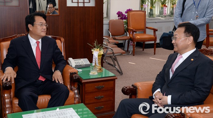 (서울=포커스뉴스) 정진석(왼쪽) 새누리당 원내대표가 11일 오전 서울 여의도 국회를 방문한 유일호 경제부총리 겸 기획재정부 장관과 면담을 하고 있다.
