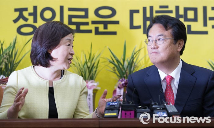(서울=포커스뉴스) 정진석(오른쪽) 새누리당 원내대표가 11일 오전 서울 여의도 국회에서 심상정 정의당 상임대표를 예방해 대화하고 있다.