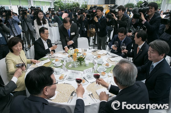 (서울=포커스뉴스) 11일 오후 서울 여의도 국회 의원회관에서 열린 20대 국회 초선의원 의정연찬회 오찬에 참석한 내빈들이 건배를 하고 있다. 왼쪽 아래부터 반시계 방향으로 정의화 국회의장, 심상정 정의당 상임대표, 박지원 국민의당 원내대표, 박준영 당선인, 문진국 새누리당 당선인, 우상호 더불어민주당 원내대표, 안철수 국민의당 상임공동대표, 박관용 전 국회의장.
