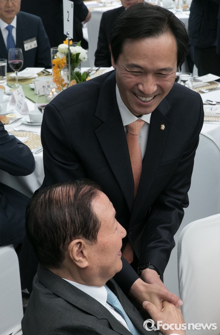 (서울=포커스뉴스) 11일 오후 서울 여의도 국회 의원회관에서 열린 20대 국회 초선의원 의정연찬회 오찬에 참석한 우상호(오른쪽) 더불어민주당 원내대표와 김원기 전 국회의장이 인사하고 있다.