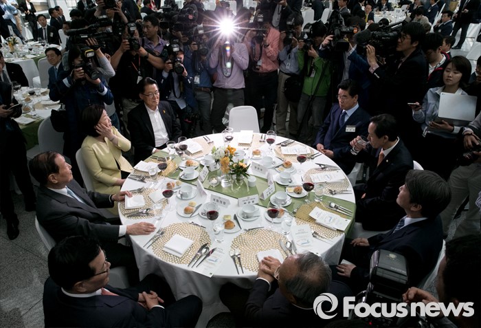 (서울=포커스뉴스) 11일 오후 서울 여의도 국회 의원회관에서 열린 20대 국회 초선의원 의정연찬회 오찬에 참석한 내빈들이 자리하고 있다. 왼쪽 위부터 반시계 방향으로 박지원 국민의당 원내대표, 심상정 정의당 상임대표, 김원기 전 국회의장, 정의화 국회의장, 박관용 전 국회의장, 안철수 국민의당 상임공동대표, 우상호 더불어민주당 원내대표, 문진국 새누리당 당선인.