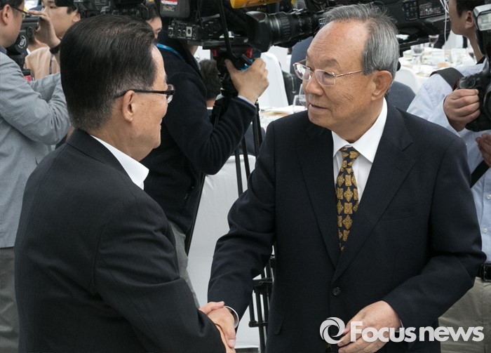 (서울=포커스뉴스) 11일 오후 서울 여의도 국회 의원회관에서 열린 20대 국회 초선의원 의정연찬회 오찬에 참석한 박관용(오른쪽) 전 국회의장과 박지원 국민의당 원내대표가 인사하고 있다.