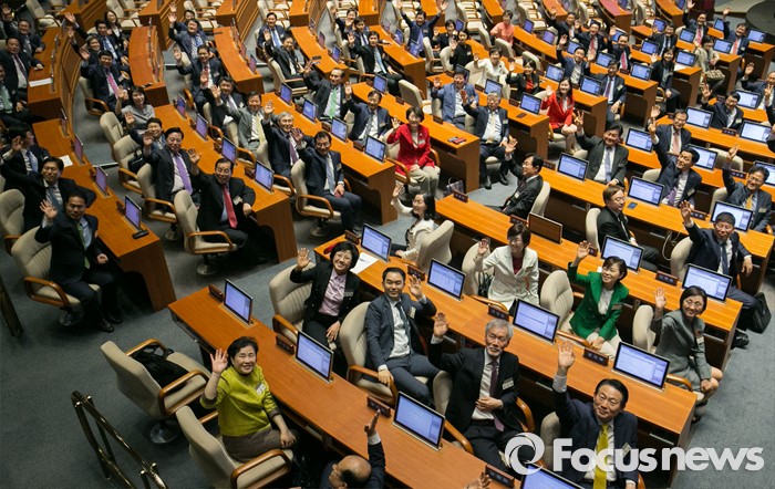 (서울=포커스뉴스) 11일 오후 서울 여의도 국회 본회의장을 방문한 20대 국회 초선 당선인들이 전자투표 시연 교육 등을 받은 뒤 취재진의 요청으로 손을 흔들고 있다.