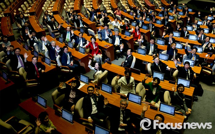 (서울=포커스뉴스) 11일 오후 서울 여의도 국회 본회의장을 방문한 20대 국회 초선 당선인들이 전자투표 시연 교육 등을 받은 뒤 취재진의 요청으로 손을 흔들고 있다.