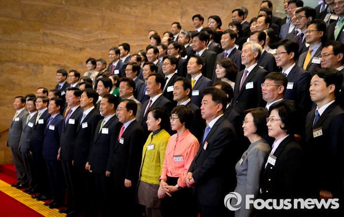(서울=포커스뉴스) 11일 오후 서울 여의도 국회 로텐더홀 계단에서 20대 국회 초선 당선인들이 전자투표 시연 등 교육을 마친 뒤 기념촬영을 하고 있다.