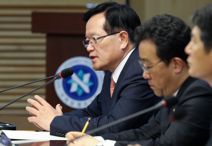 (서울=포커스뉴스) 정의화(왼쪽) 국회의장이 11일 오후 서울 여의도 국회 의원회관에서 열린 '정치 대립구도 완화를 위한 과제' 학술회의에 참석해 환영사를 하고 있다. <사진제공=국회>