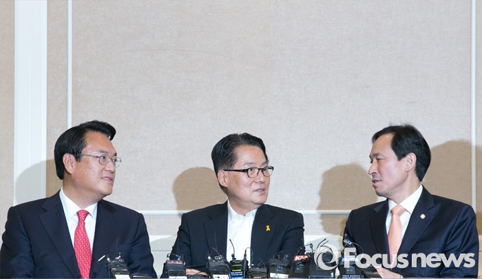 (서울=포커스뉴스) 11일 오후 서울 여의도 국회 귀빈식당에서 열린 3당 원내지도부 회동에 참석한 정진석(왼쪽부터) 새누리당 원내대표, 박지원 국민의당 원내대표, 우상호 더불어민주당 원내대표가 대화하고 있다.