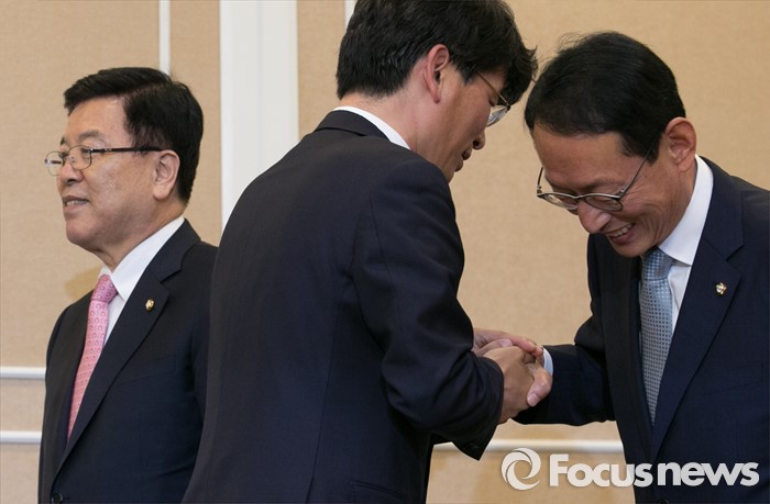 (서울=포커스뉴스) 11일 오후 서울 여의도 국회 귀빈식당에서 열린 3당 원내지도부 회동에 참석한 김도읍(오른쪽) 새누리당 원내수석부대표와 박완주(가운데) 더불어민주당 원내수석부대표가 인사하고 있다. 왼쪽은 김광림 새누리당 정책위의장.