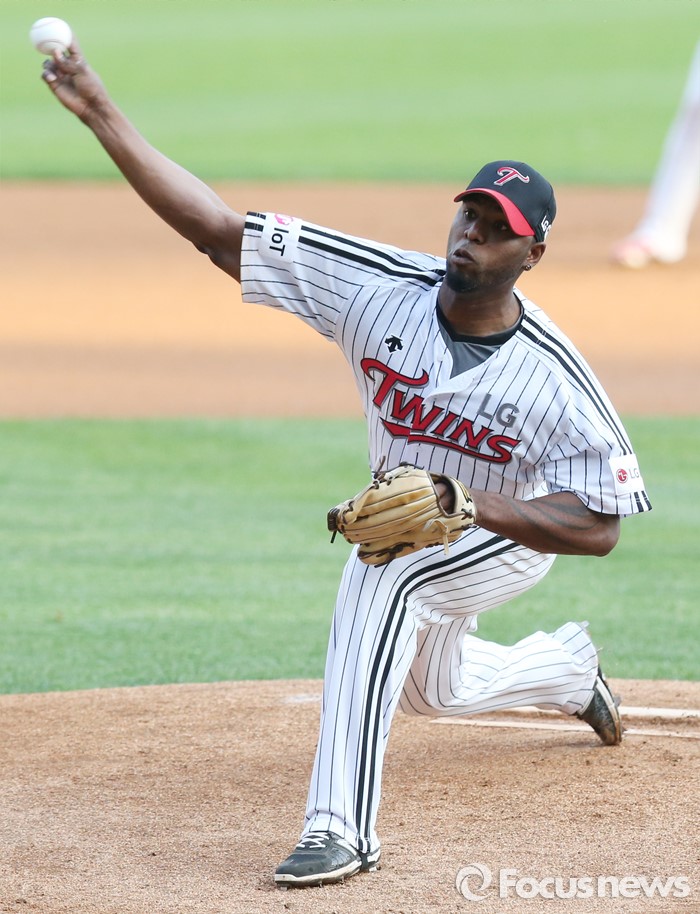 △ 힘차게 볼을 뿌리는 LG 선발투수 소사