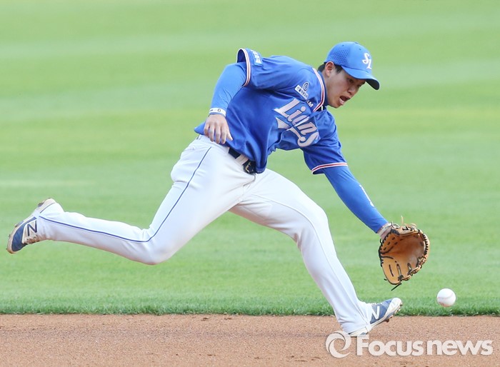 (서울=포커스뉴스) 11일 서울 잠실구장에서 열린 2016 프로야구 삼성-LG 경기 1회말 2사 1,2루에서 삼성 유격수 김재현이 LG 채은성의 2루쪽 땅볼을 달려가 잡고 있다.