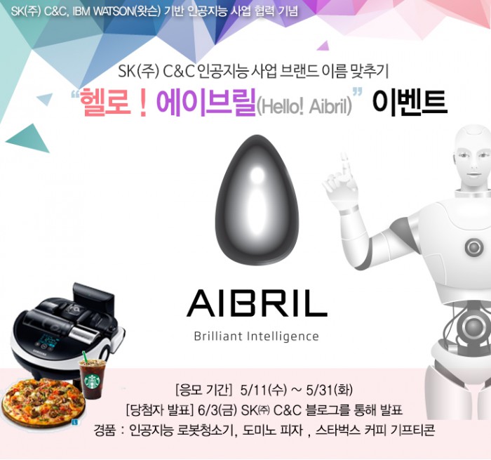 SK C&C는 에이브릴 출시를 기념해 31일까지 3주간 인공지능 사업 브랜드 이름 맞추기 ‘헬로! 에이브릴(Hello! Aibril)’ 이벤트를 진행한다. SK C&C 블로그에 접속한 뒤 인공지능 사업 브랜드 이름 맞추기 퀴즈 이벤트 페이지에서 퀴즈 정답을 댓글로 작성하면 된다.