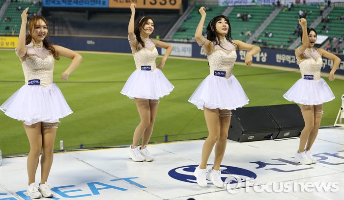 (서울=포커스뉴스) 11일 서울 잠실구장에서 열린 2016 프로야구 삼성-LG 경기에서 LG 치어리더가 순백의 짧은 치마를 입고 정열적인 안무로 관중들의 시선을 모으고 있다.