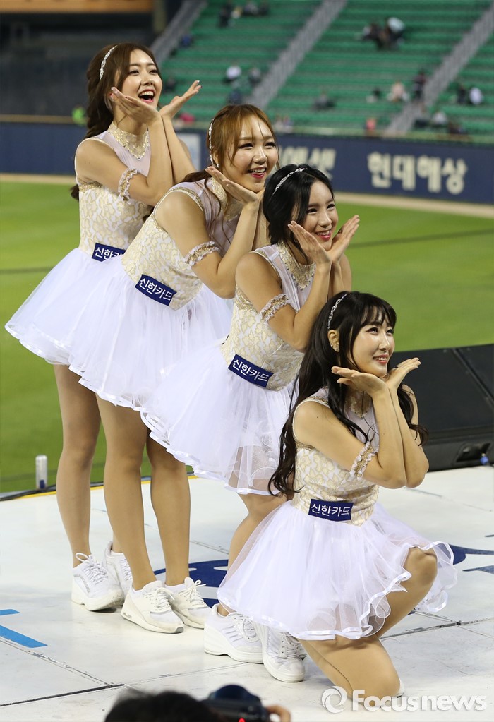 (서울=포커스뉴스) 11일 서울 잠실구장에서 열린 2016 프로야구 삼성-LG 경기에서 LG 치어리더가 순백의 짧은 치마를 입고 정열적인 안무로 관중들의 시선을 모으고 있다.