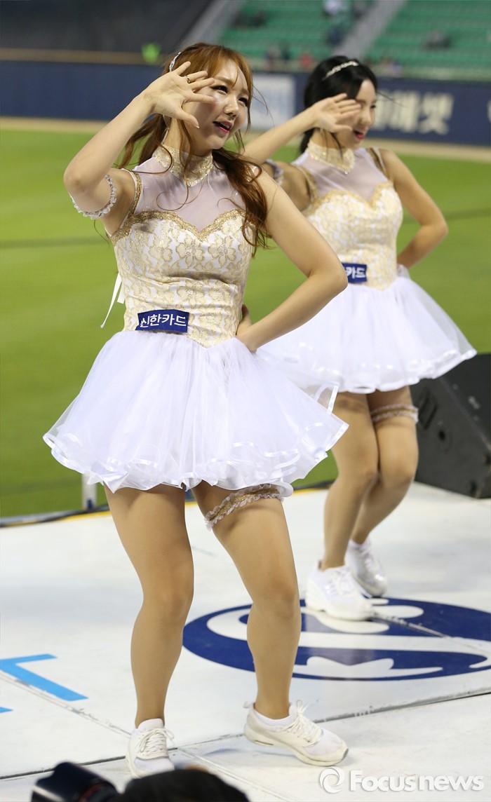 (서울=포커스뉴스) 11일 서울 잠실구장에서 열린 2016 프로야구 삼성-LG 경기에서 LG 치어리더가 순백의 짧은 치마를 입고 정열적인 안무로 관중들의 시선을 모으고 있다.