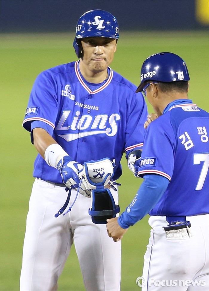 (서울=포커스뉴스) 11일 서울 잠실구장에서 열린 2016 프로야구 삼성-LG 경기 8회초 2사 3루에서 삼성 이승엽이 우익선상으로 빠지는 2루타를 치고 김평호 코치와 주먹을 마주치고 있다.