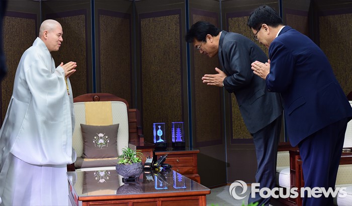 (서울=포커스뉴스) 정진석(오른쪽 두 번째) 새누리당 원내대표가 12일 오전 서울 종로구 조계사에서 자승 대한불교조계종 총무원장을 예방해 인사 하고 있다.