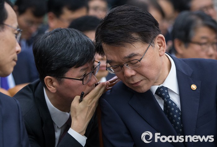 (서울=포커스뉴스) 강호인 국토교통부 장관이 12일 오전 서울 여의도 국회에서 열린 국토교통위원회 전체회의에서 국토부 관계자들과 대화하고 있다.