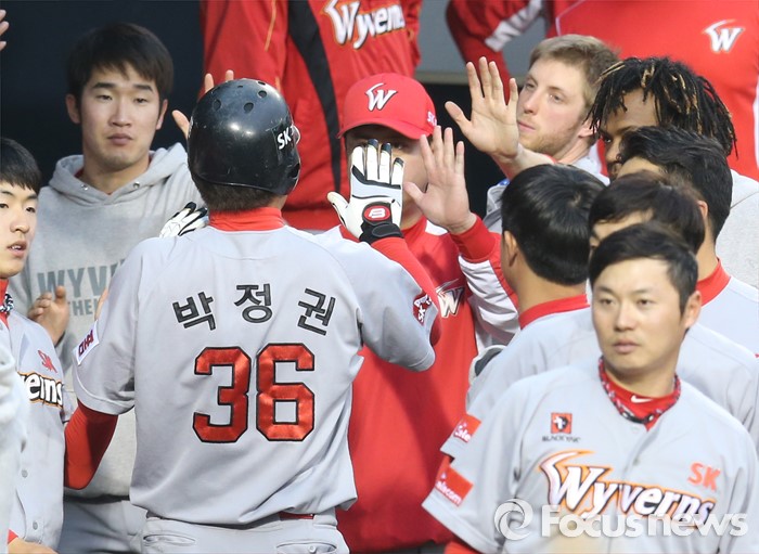 박정권은 안면장애 및 화상환자를 돕는 '행복드림안타 캠페인'에도 참여하고 있다. 홈런과 안타를 때려낼 때마다 기금을 적립하는 선행을 이어가고 있다.(서울=포커스뉴스) 26일 서울 잠실구장에서 열린 2016 프로야구 SK-두산 경기 2회초 1사후 SK 김성현의 중전안타로 득점한 3루주자 박정권이 덕아웃에서 동료들의 환영을 받고 있다. 2016.04.26 우정식 기자