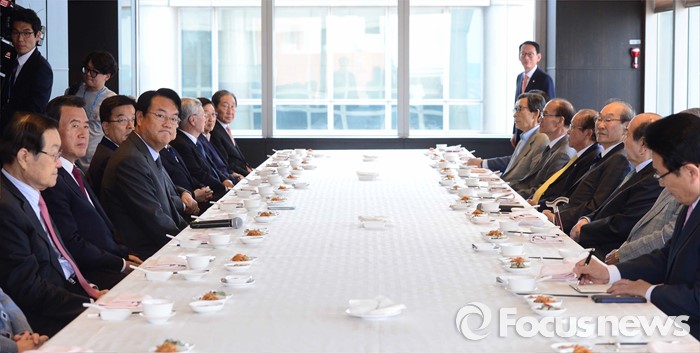 (서울=포커스뉴스) 정진석(왼쪽 세번째) 새누리당 원내대표 등이 12일 오후 서울 여의도 한 중식당에서 상임고문단과 오찬을 하고 있다.