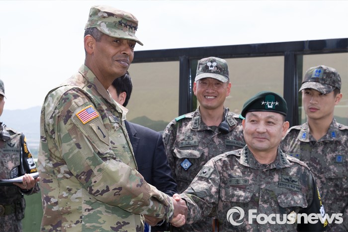 (파주=포커스뉴스) 빈센트 브룩스(왼쪽) 신임 한·미연합사령관 겸 주한미군사령관과 이순진 합참의장이 12일 오후 경기도 파주시 JSA(공동경비구역)를 방문, 오울렛 초소에서 악수를 하고 있다.