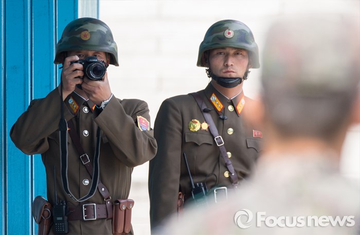 (파주=포커스뉴스) 빈센트 브룩스 신임 한·미연합사령관 겸 주한미군사령관과 이순진 합참의장이 12일 오후 경기도 파주시 판문점 공동경비구역(JSA)을 방문하는 동안, 북한군 병사들이 미군과 남측 인원들을 주시하고 있다.
